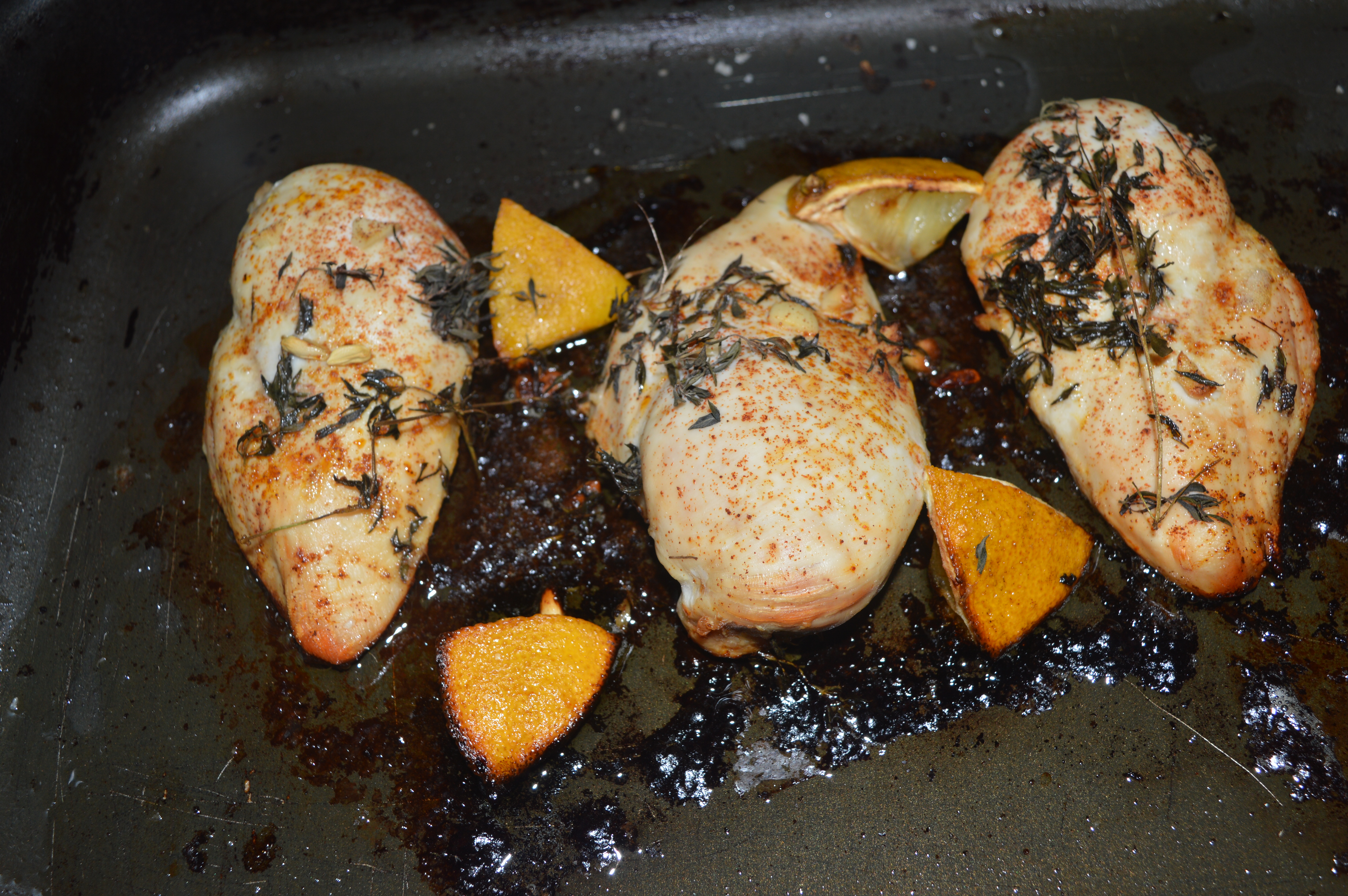 Preheat your oven to 200°C. Trim your chicken breasts as desired and place on a roasting tray (mine was a bit big for the amount of chicken). Sprinkle over the paprika so that it your chicken is covered with a light dusting of it. Then sprinkle over your salt and pepper. Crush your garlic and distribute this evenly over your baking tray. Cut your lemon into 8 pieces and do likewise. Add dots of butter over your chicken and drizzle with your olive oil. Top the whole thing with your thyme and put it all in the oven for about 20 – 25 minutes (when your chicken is cooked through basically).