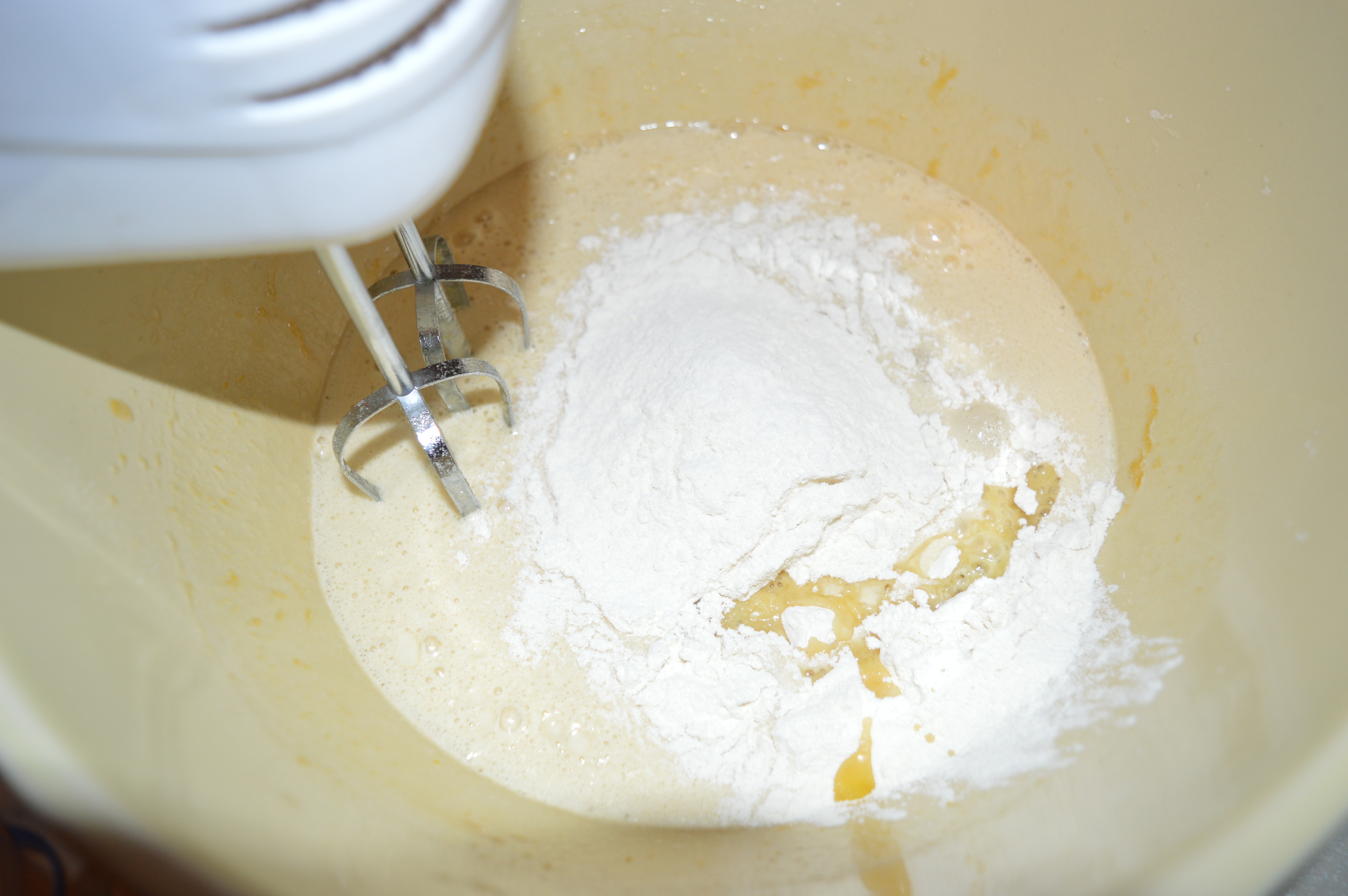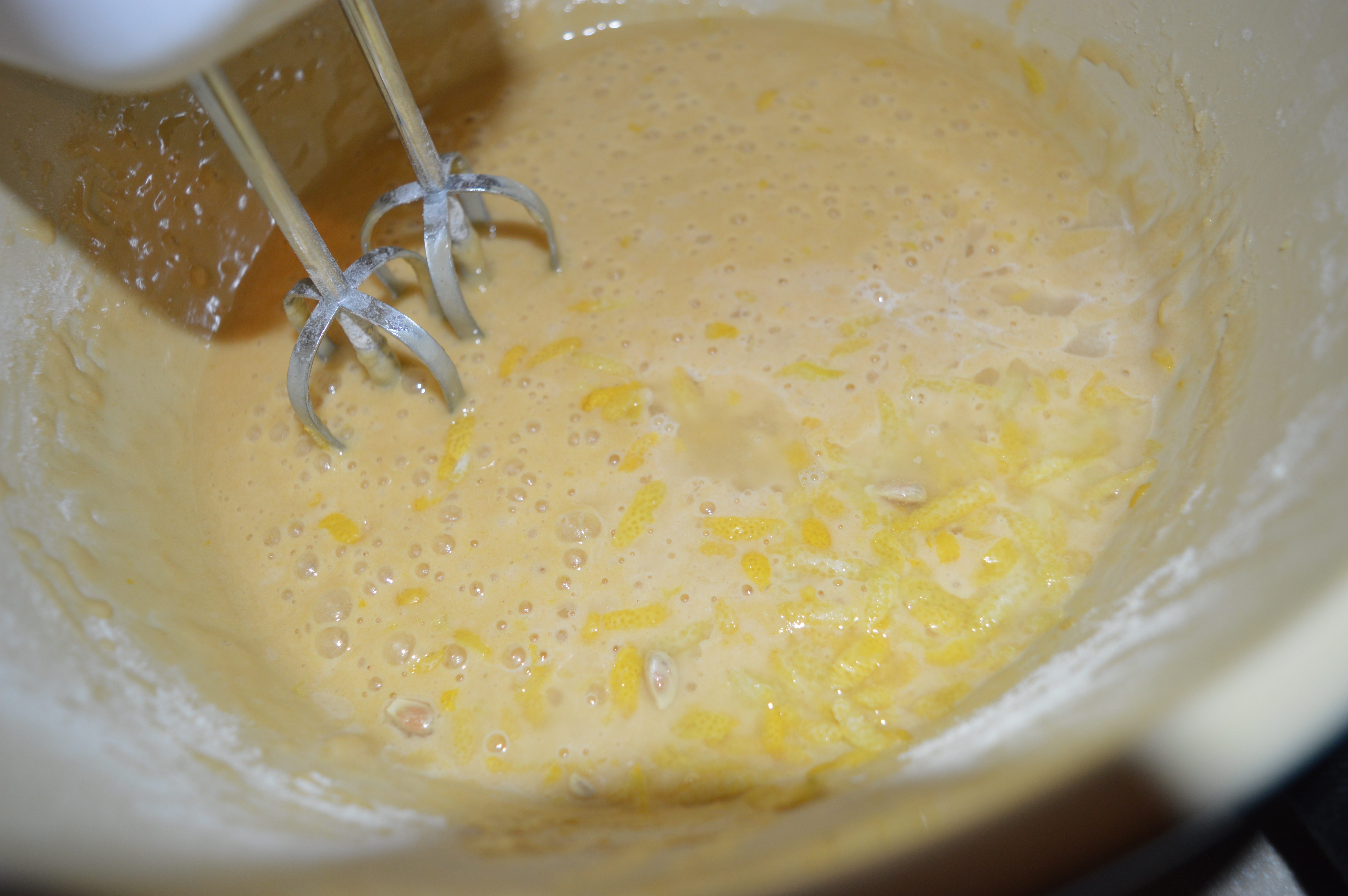 Preheat your oven to 180°C. In a large mixing bowl whisk your eggs and sugar until they leave a trail on the surface of the mix. To this add half your butter and sift in half your flour, Mix well and add the other half of both. Once all the ingredients have formed a smooth mix grate in your lemon zest and add your juice. Don’t be stingy on the zest – my parents have both told me that the flavour of the zest is more important than the juice in this type of recipe.