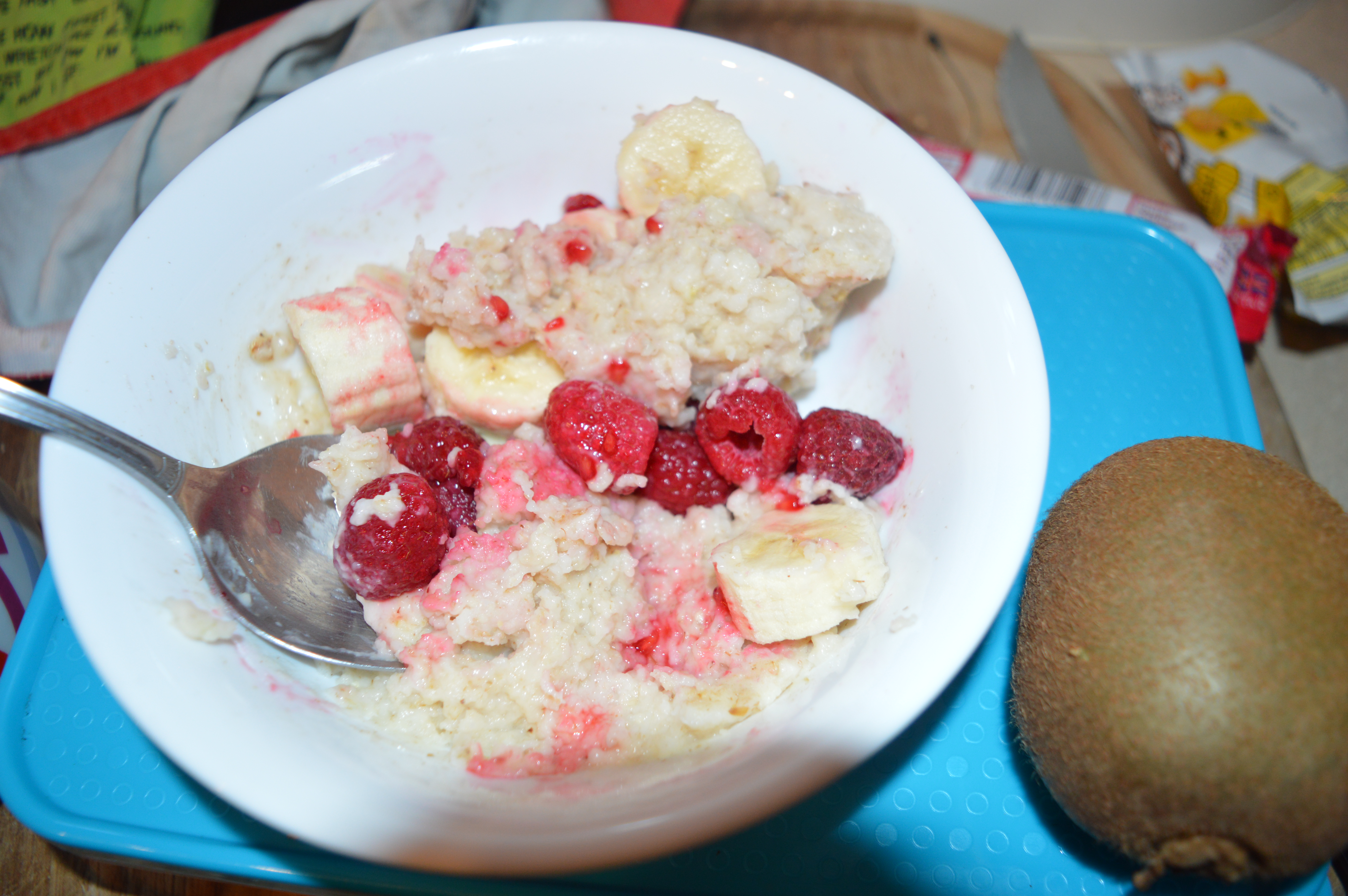 Overnight oats have become a favourite in our house. They’re really good value for money to make, they’re filling, they taste beautiful and they travel well. To make 2 portions take a mug full of oats, top with fruit juice to 1cm above the oats (I’ve used apple juice and mango juice so far), cover this and leave overnight. The next morning add a couple of tablespoons of yogurt (I used Alpro Soya yogurt with coconut in mine and low fat lemon on D’s). Then top with whatever fruit, nuts or seeds you fancy. I put D’s in his soup mug and he eats them on the bus – just make sure your container is sealed tightly.