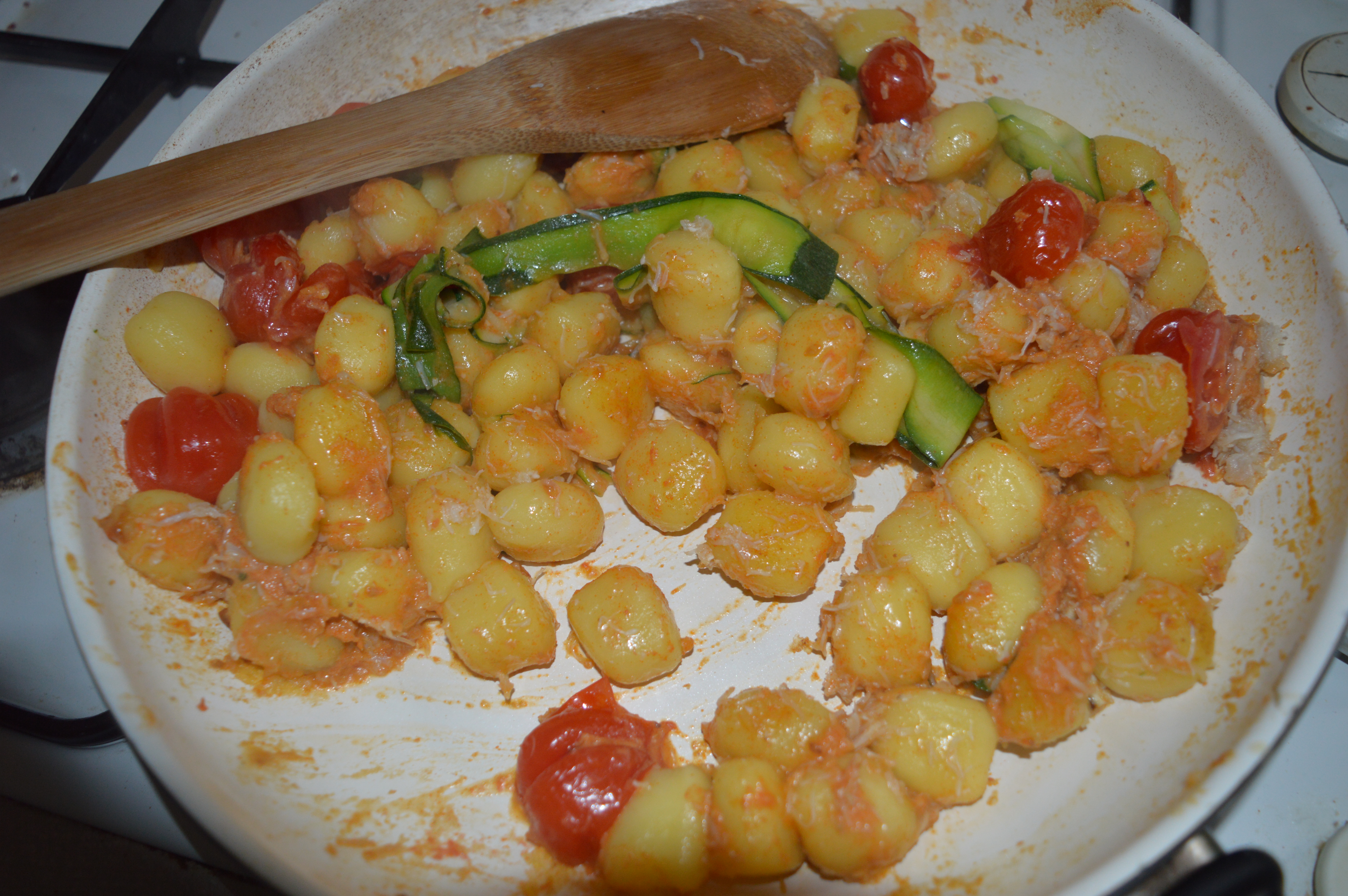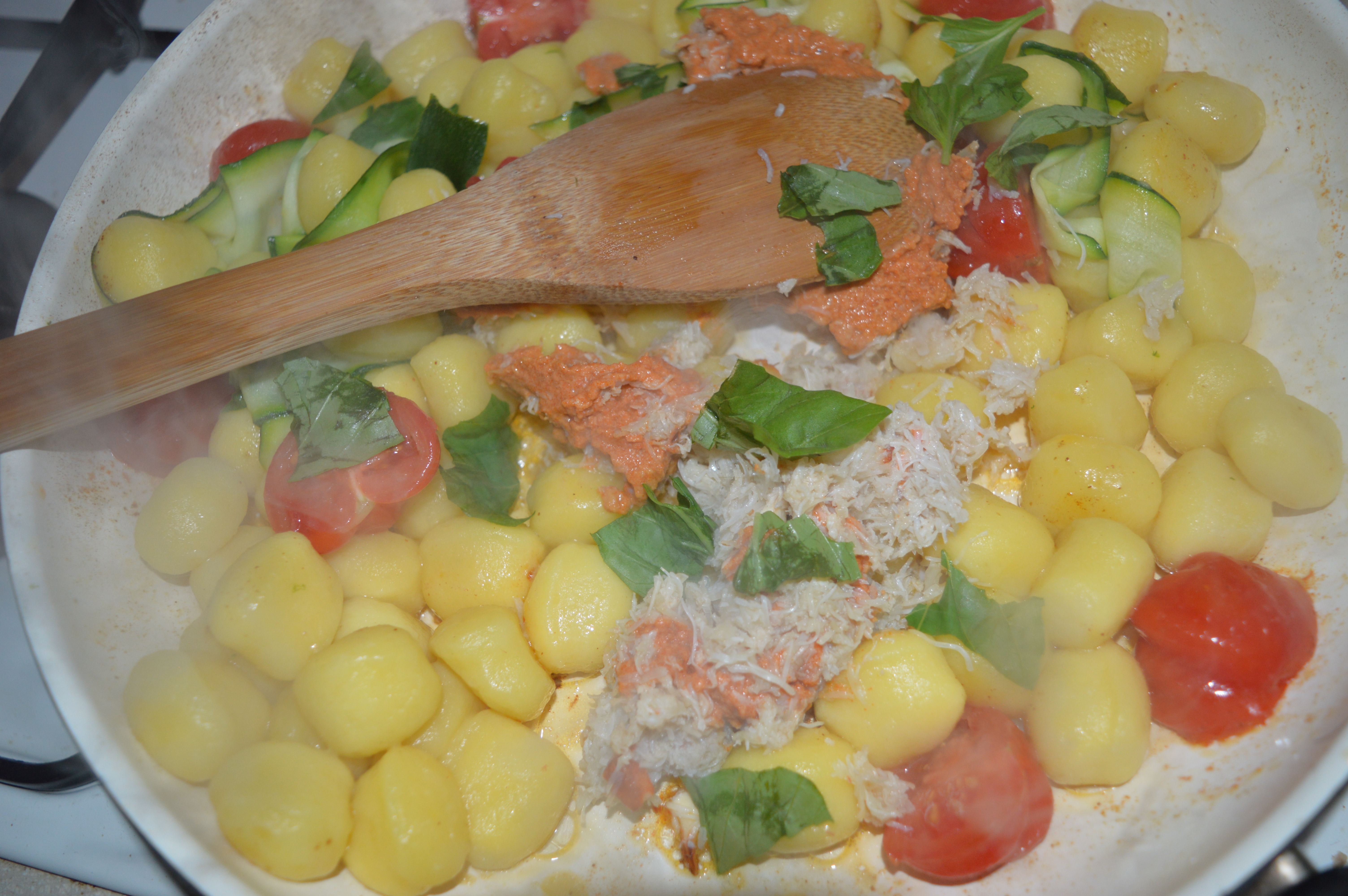 Cook your gnocchi according to the instructions on the packet. While this is cooking half your tomatoes. Crush your garlic and fry on a low heat in the butter. Sprinkle in the chilli powder and season with salt and pepper. Add the tomatoes and use a potato peeler to peel in the courgette so that it forms ribbons. Stir in the gnocchi and the crab meat and tear in the basil leaves.