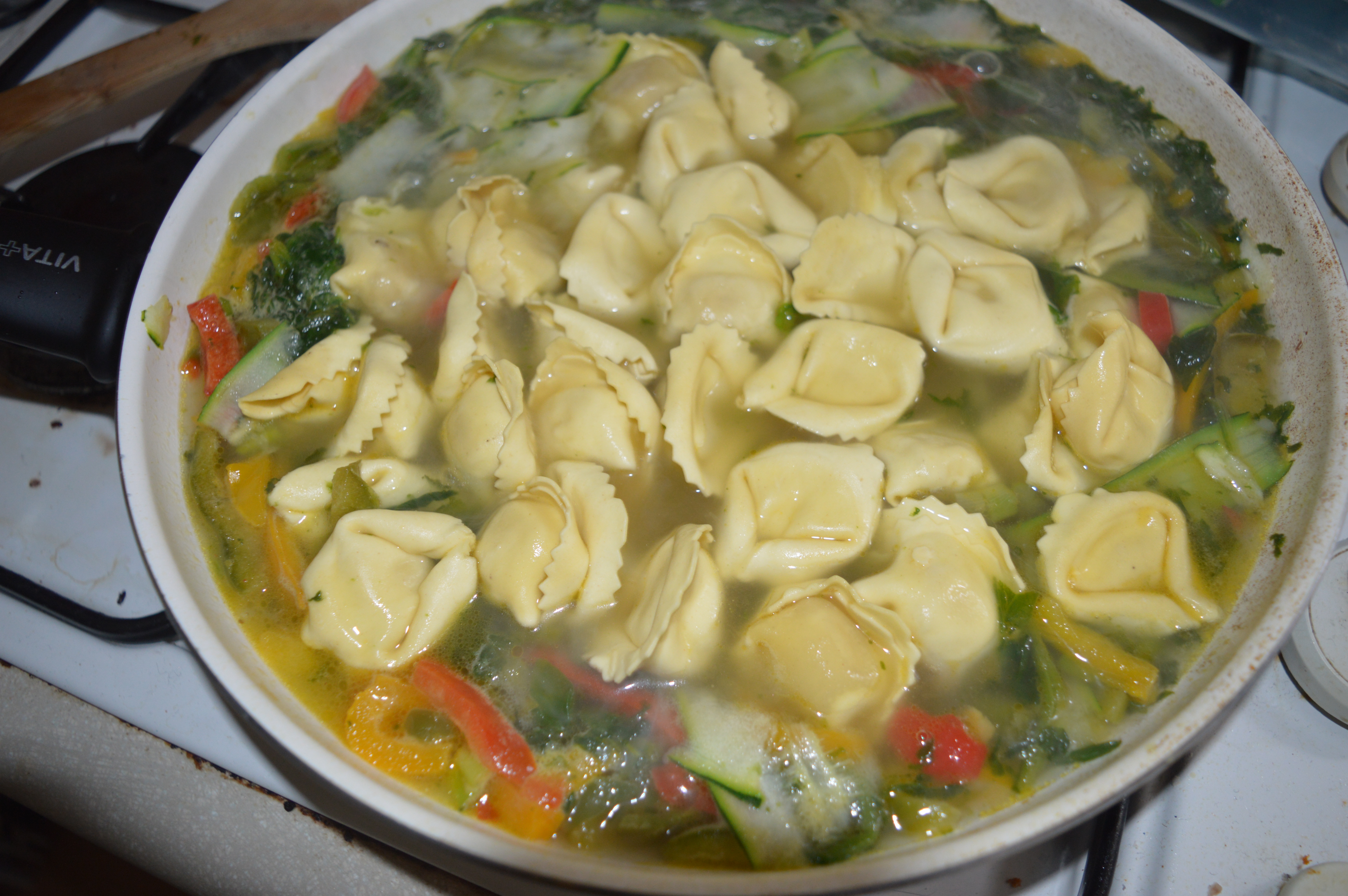 Fry your spring onions, along with your peppers and frozen spinach in the butter until the spinach has defrosted. Add extra butter while cooking if required (If using fresh spinach add this when the tortellini is added). Pour over your stock and add your rosemary and allow this to start simmering. Use a potato peeler to make thin slices of courgette (can you tell this is my new food obsession?) and add to the stock. Taste and season with salt and pepper as required.