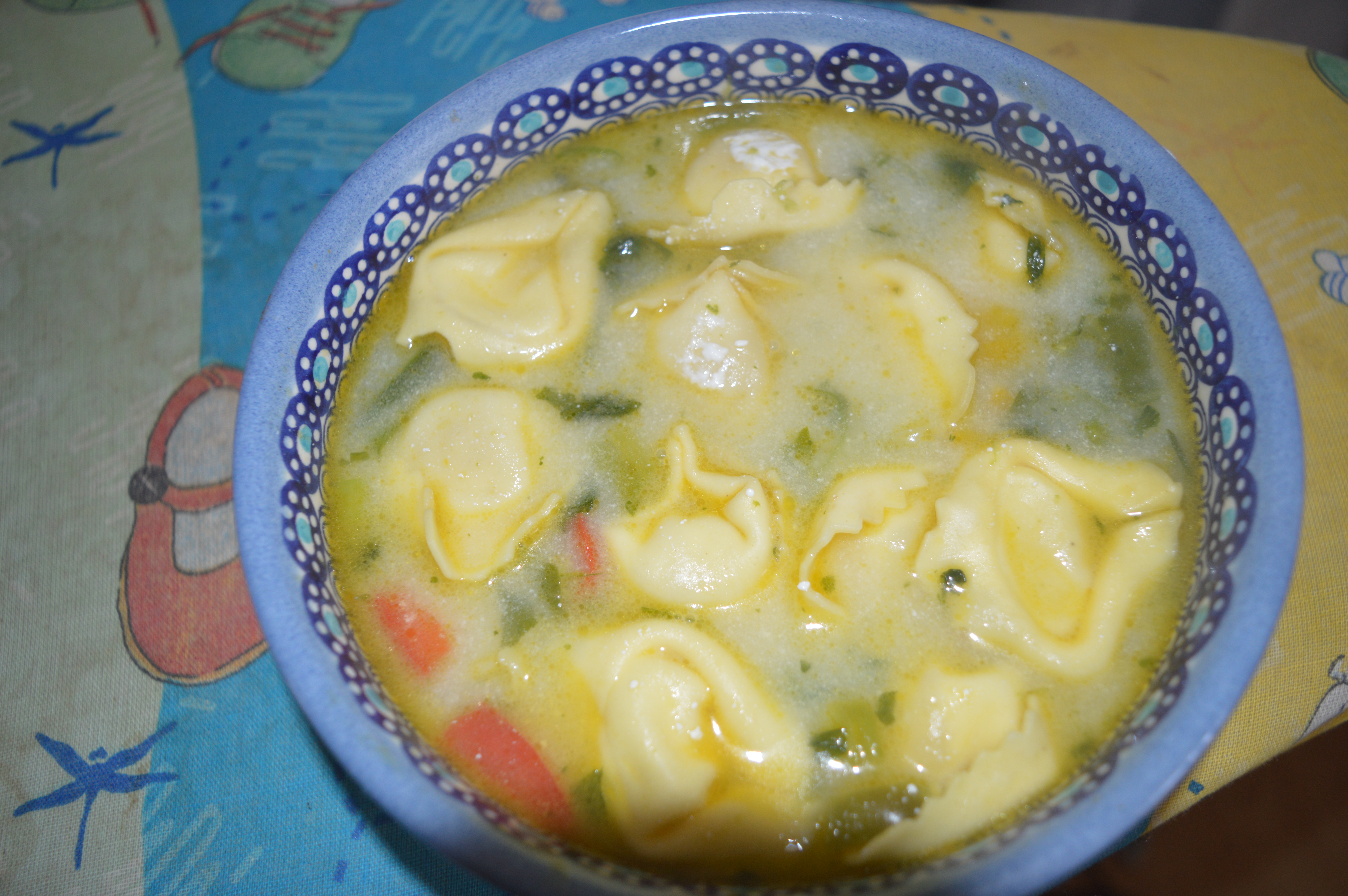 I always associate soups with Autumn and winter weather. I just cannot fathom the idea of eating something like leek and tomato soup on a warm day. However this soup has a light fresh flavour and takes about 20 minutes so you won’t be sweating over a hot stove for too long. The tortellini make this a hearty meal – so this is perfect after a busy day. Tortellini is often served as quite a stodgy meal in the UK (although I ate it with just butter in Italy and it was a starter there). However, this is a slightly lighter take on a quick and easy favourite and you will find you eat far less pasta than usual.