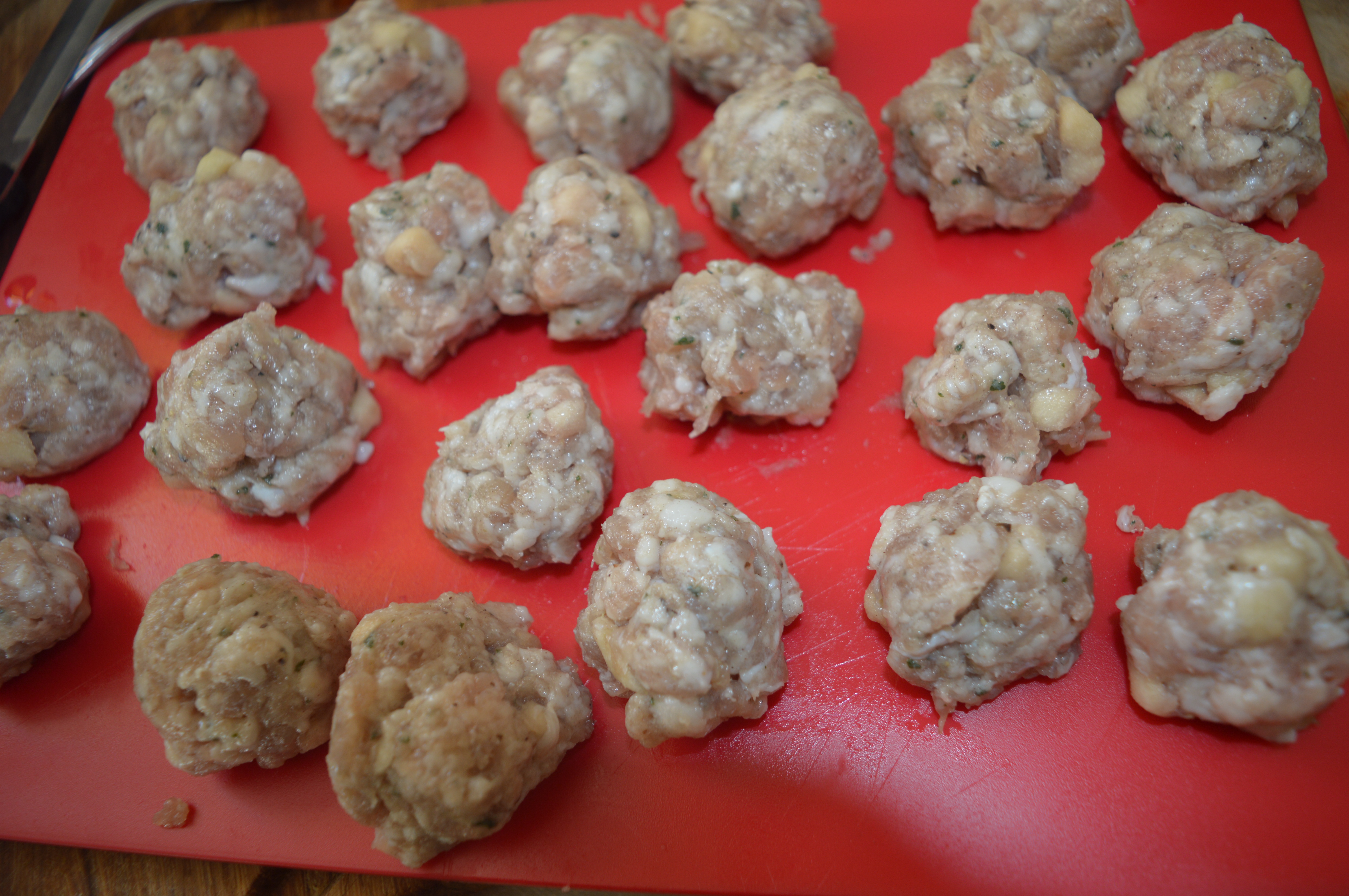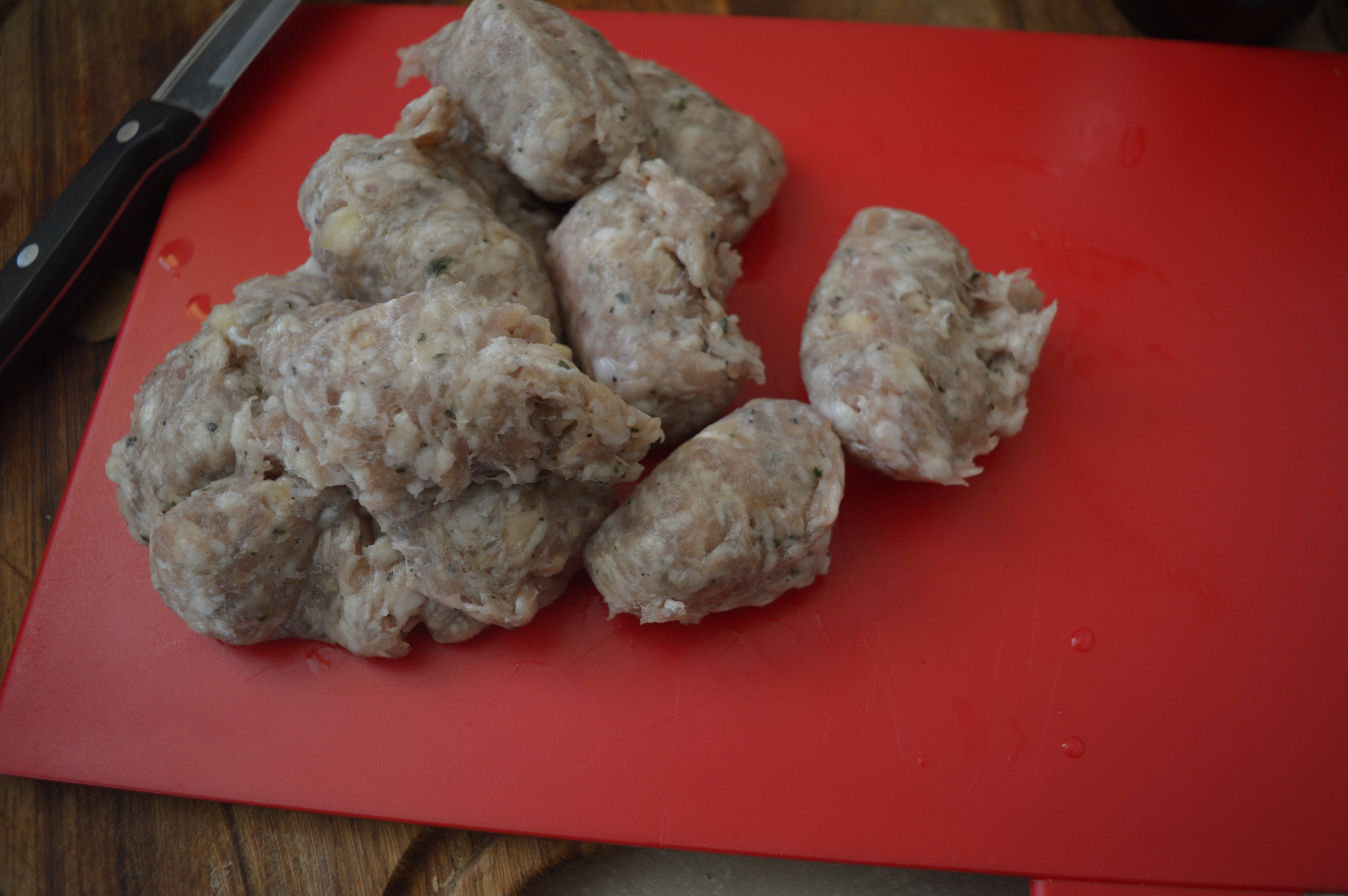Remove the sausages from their skins by squeezing the meat out with the flat of a knife. Shape the meat into small meatball shapes (about 2cm in size). Put these into the fridge to cool for approximately 30 minutes (or longer if you wish).
