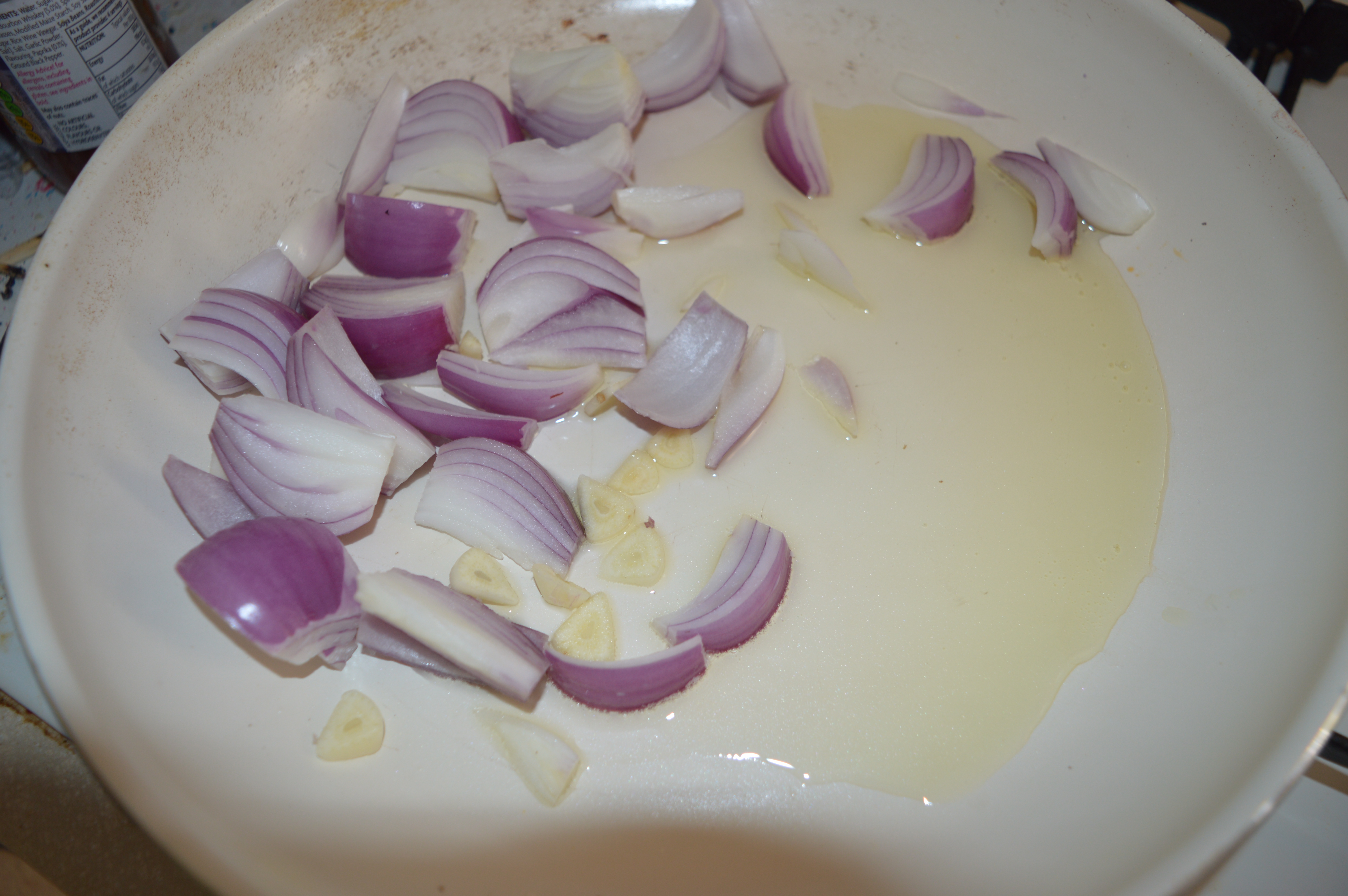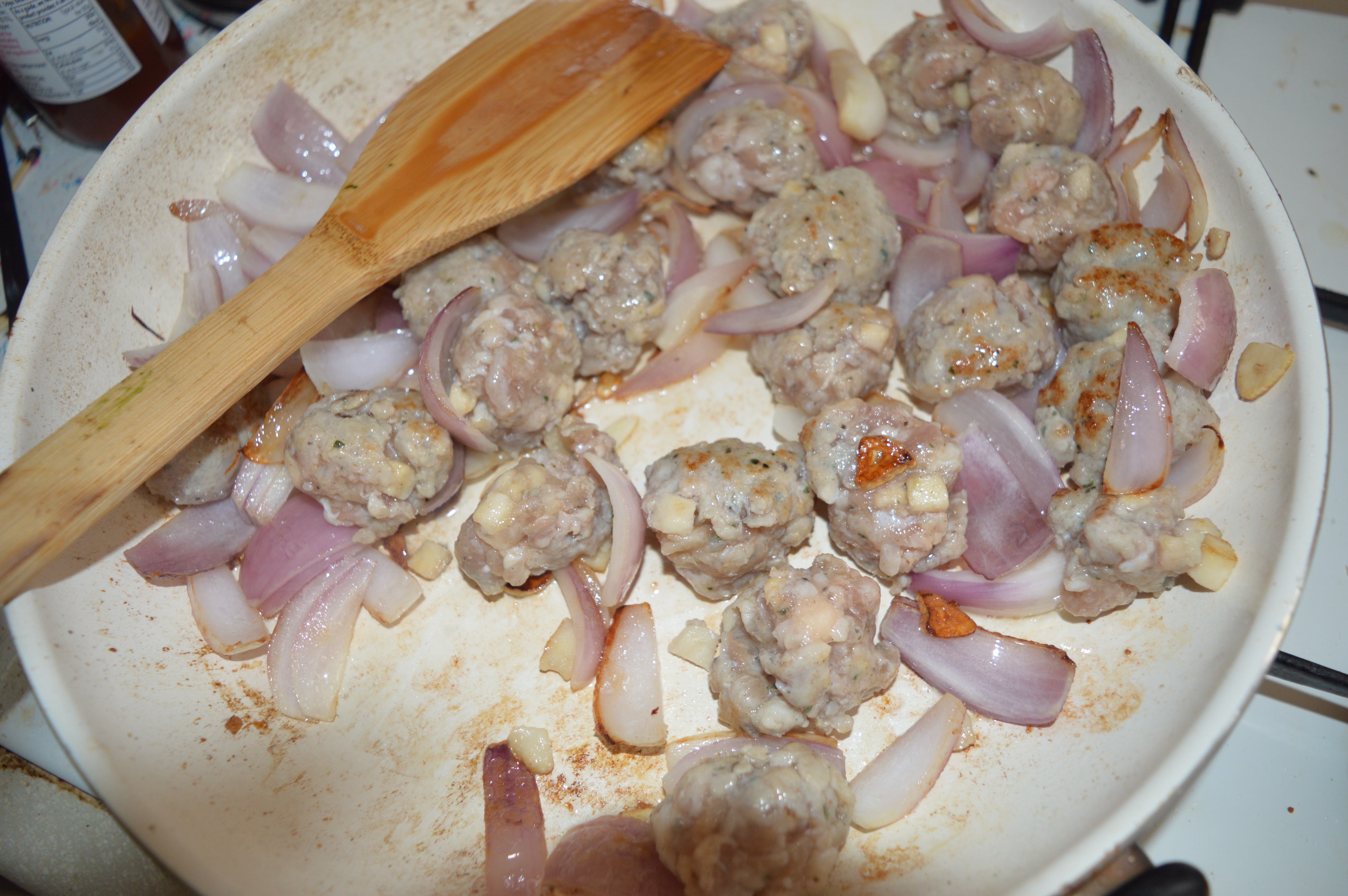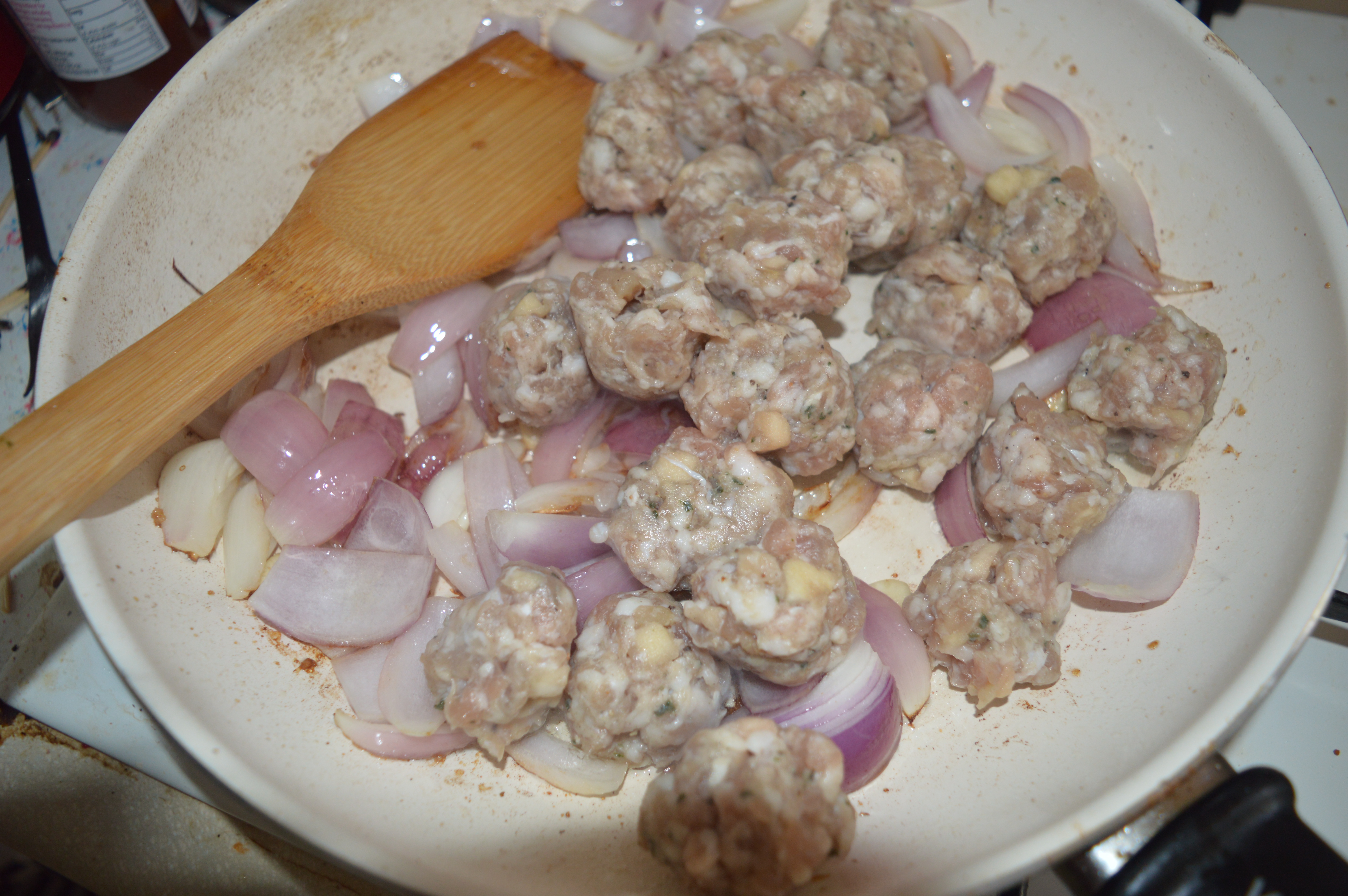 While the meatballs are chilling prepare your onions by peeling them and cutting them into segments and peel and crush the garlic. Heat these in the olive oil over a moderate heat until soft. Just as the onions soften add the brown sugar and allow the onion to caramelise.