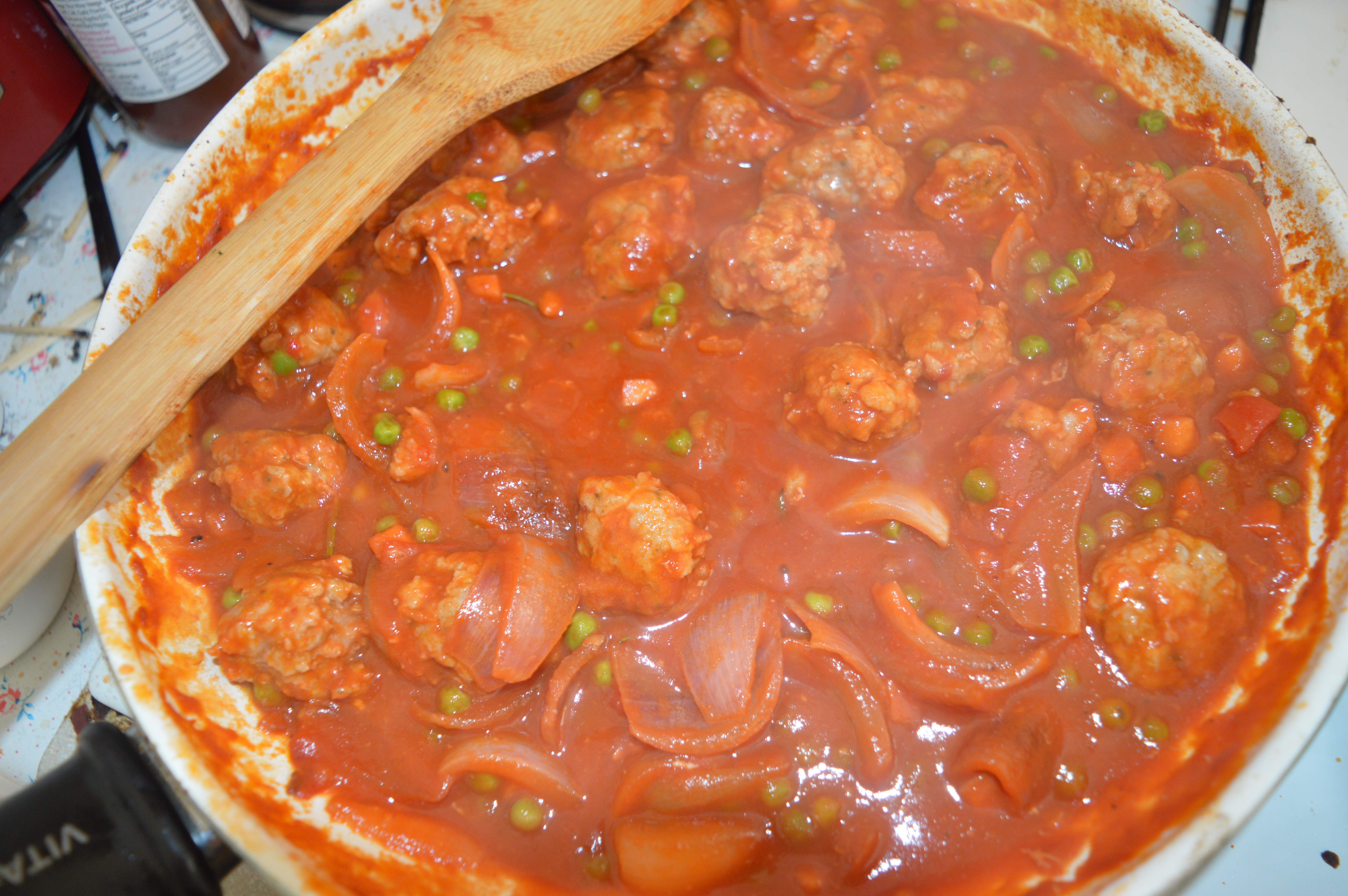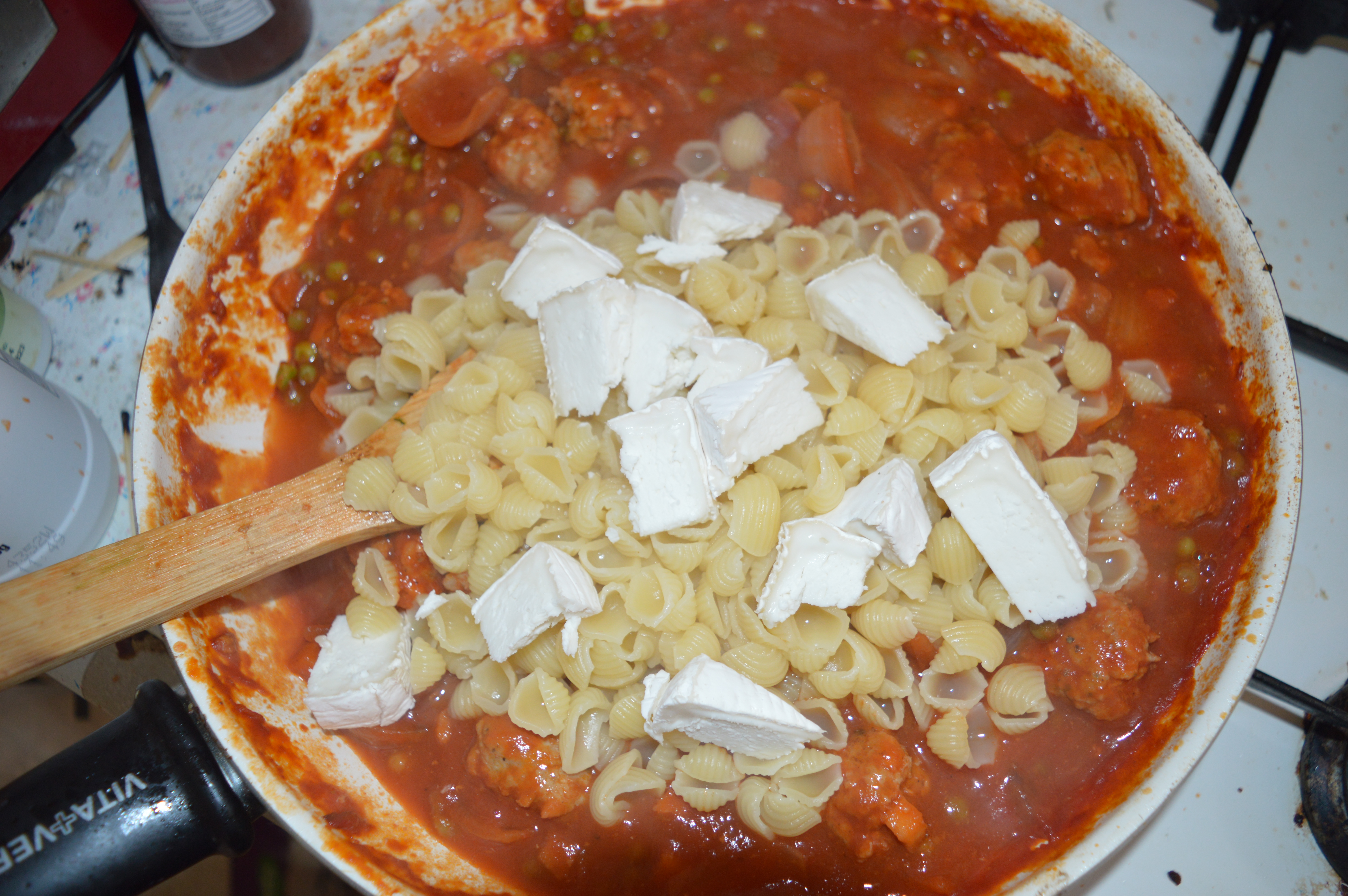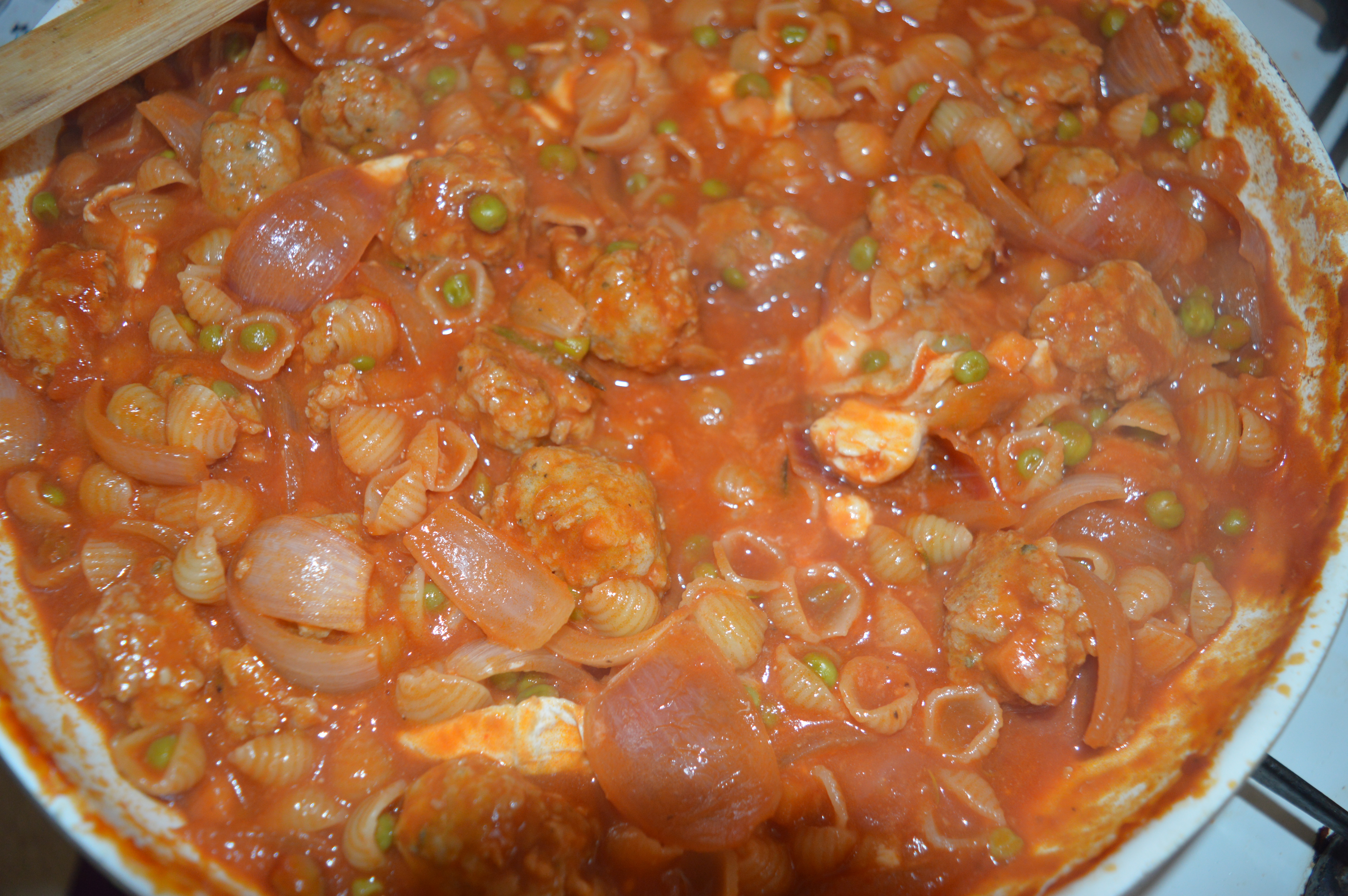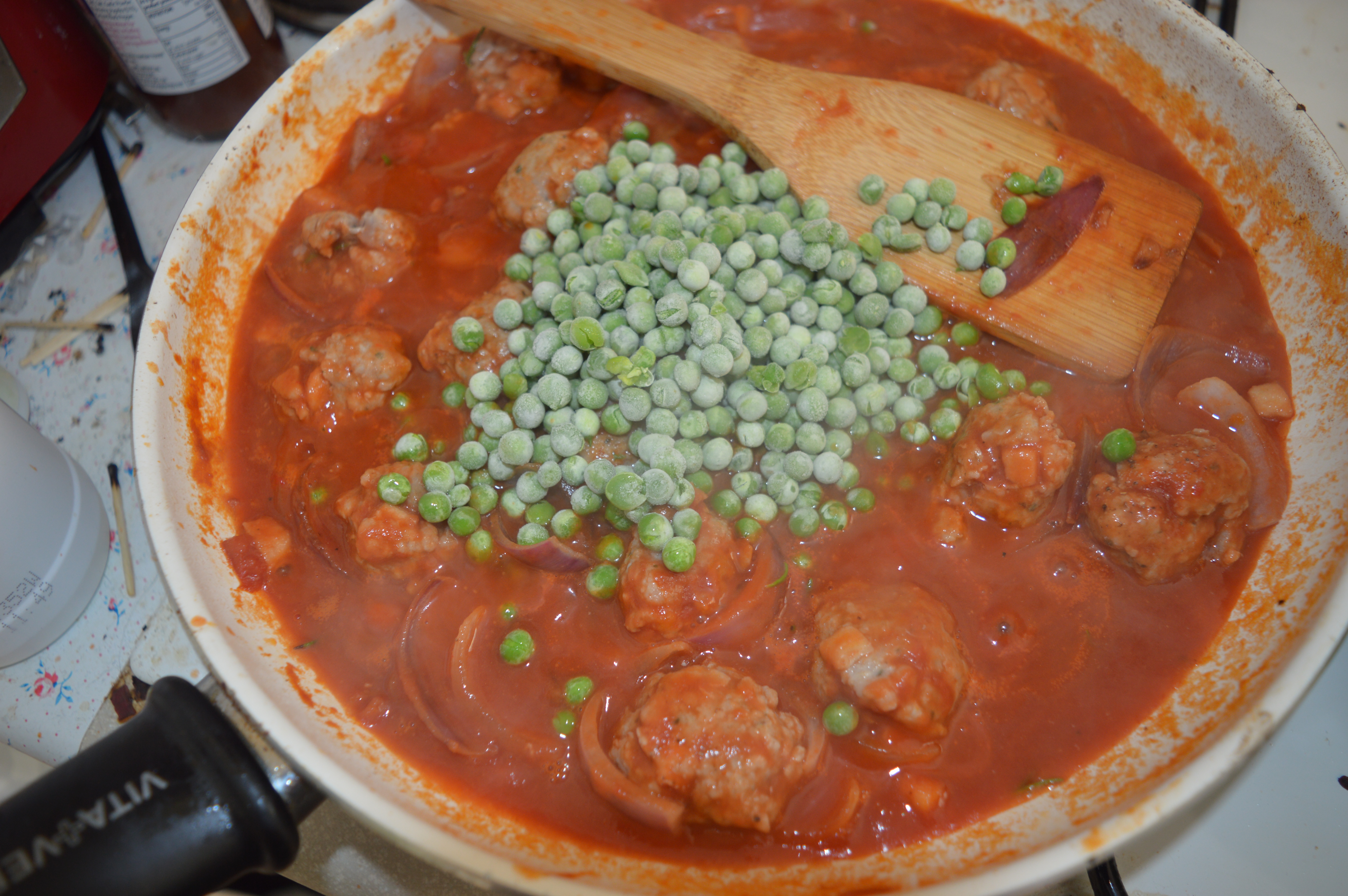 Add the meatballs and heat, stirring gently until the meatballs are starting to brown. To this add the passata, salt and pepper, wine, rosemary, soy sauce, peas and Worcester sauce (if using). Start cooking the pasta as per the instructions on the pack. While the pasta is cooking gently simmer the meatballs.
