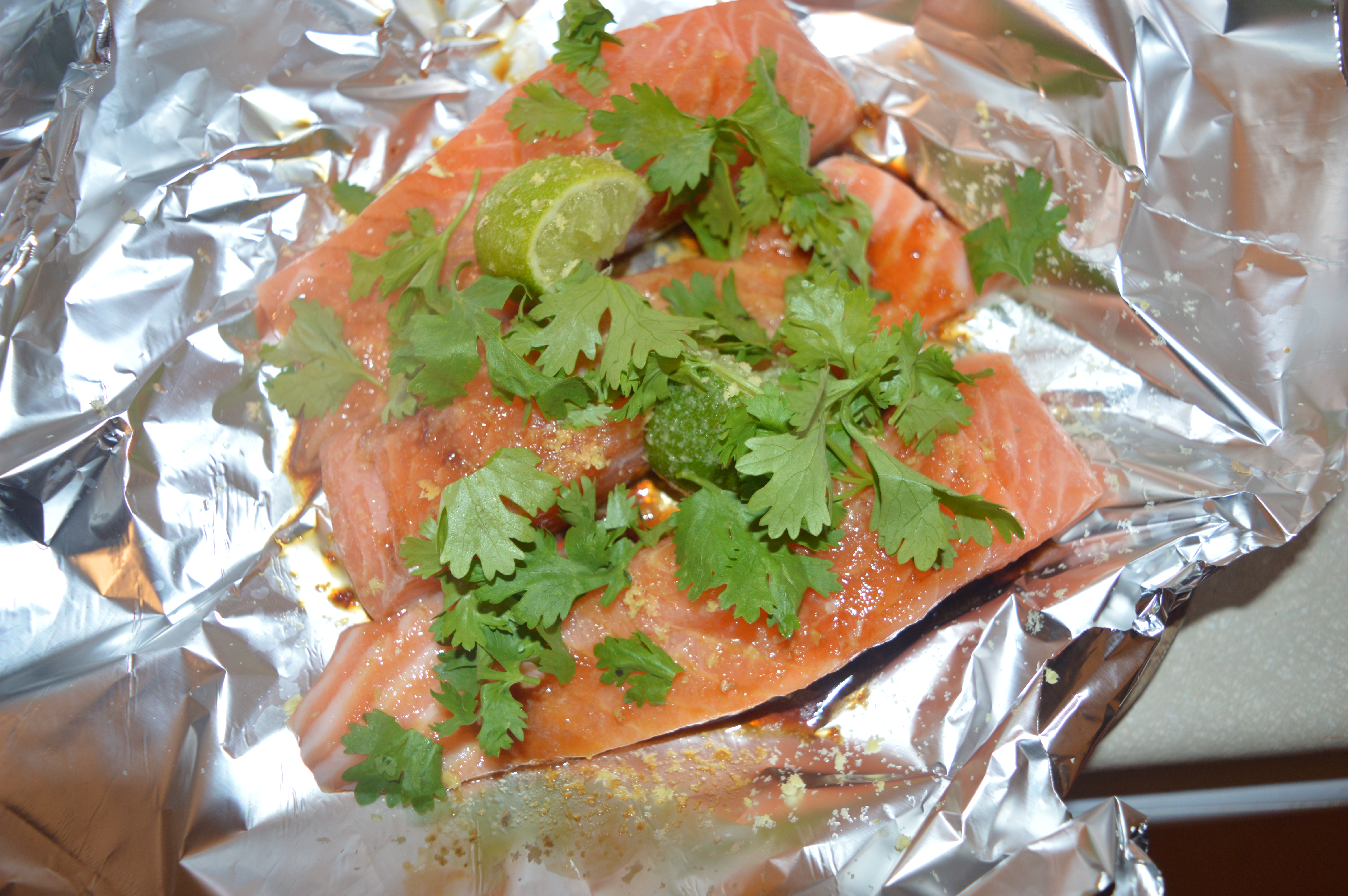 Anyway, this recipe is so easy, as long as you have a working oven you can make this while half asleep. Perfect for nights when you really can’t be bothered cooking for too long. The fresh coriander and lime work really well together and quite honestly the combination of flavours made me like salmon just a little bit more. We ate this with rice and peas enjoying all of the omega 3 goodness.