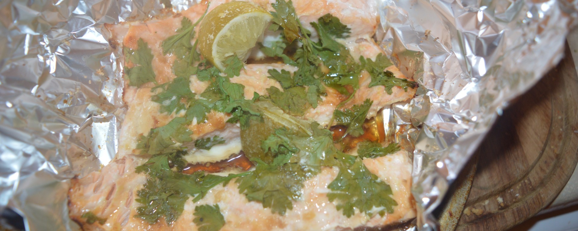 Preheat your oven to 200°C. Place your salmon on a piece of tin foil large enough to make a parcel and drizzle over the soy sauce. Grate over a generous helping of ginger. Quarter your lime and squeeze over the juice, place the lime wedges between the salmon fillets. Top with the fresh coriander and wrap into a parcel. Bake for 25 minutes.