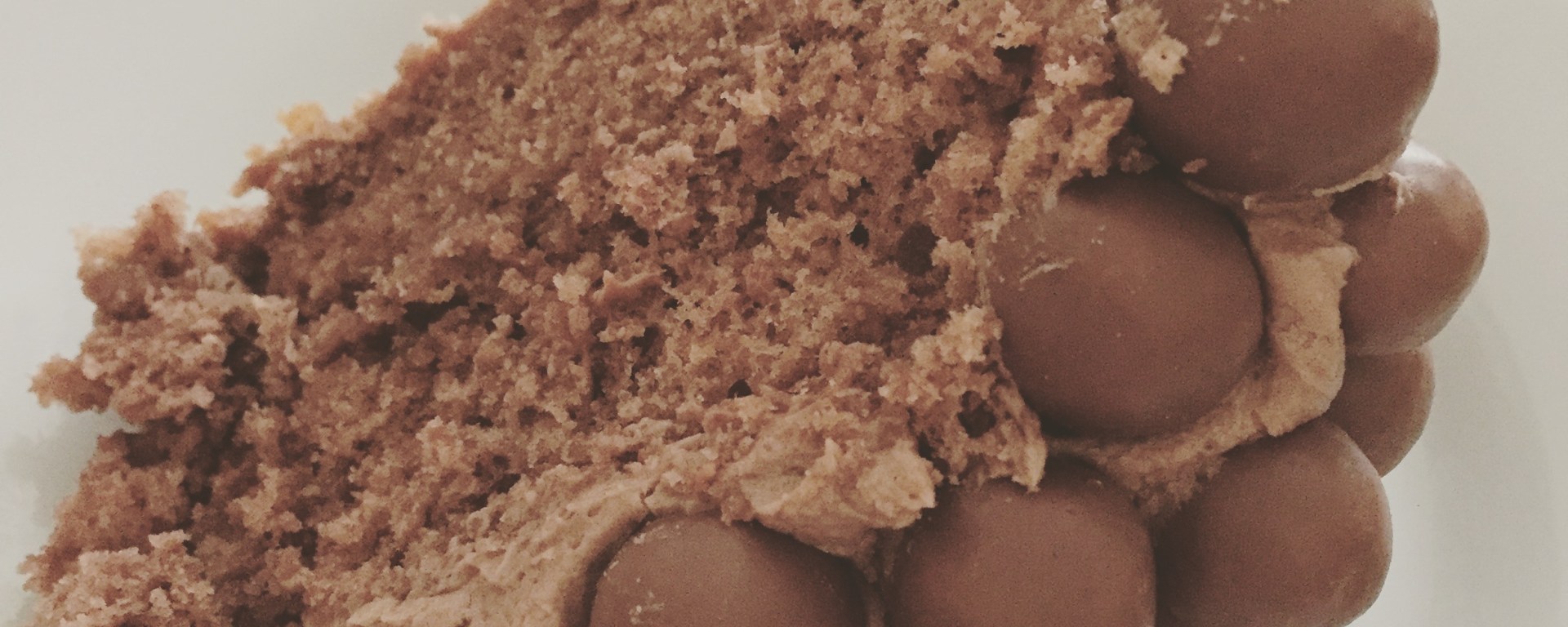 Remove the paper from the cakes and sandwich together using a thin layer of the buttercream. Then cover the cake with the remainder. Once the cake is covered add the Malteaser chocolates as desired. I put mine on in a compact manner, but you can do it in a patter or dot them around a bit more if you wish.