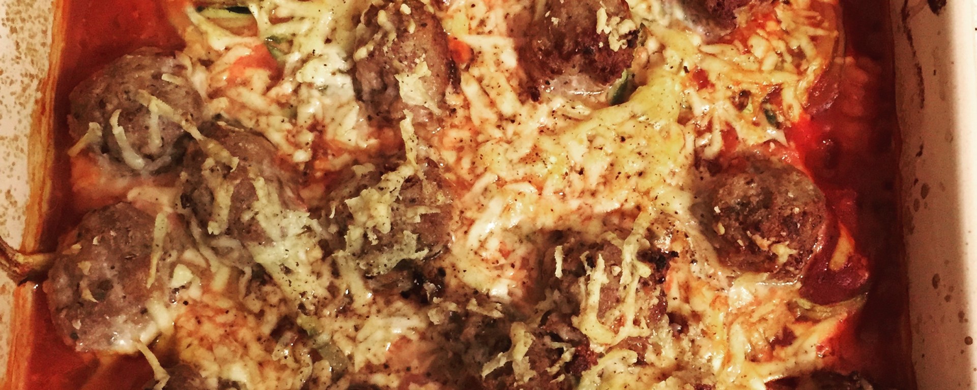 Put the pasta in a casserole dish (I used my beloved Le Creuset). Make a sauce by mixing together your passata, salt, pepper, balsamic vinegar and chilli sauce. Pour this over the pasta and spiralize or grate over your courgette. (I have one like this, thanks Grandma!). Top the courgetti with the meatballs and cheese. Bake in an oven preheated to 200°C for 30 minutes.