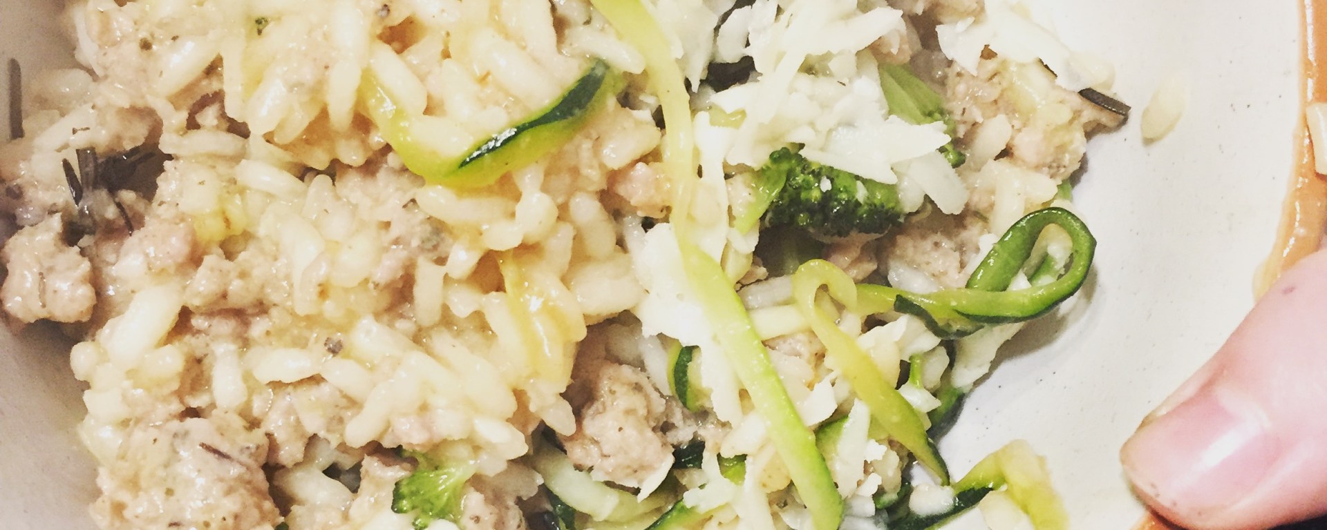 Fry the rice in this for 1 minute and then add half the chicken stock, rosemary and wine and turn down to a low heat. Stir this occasionally and add more stock as the rice absorbs the liquid (and it evaporates). Once the rice seems partially cooked add the broccoli and either spiralize in the courgette (or use a potato peeler to make small pieces of it). Once the rice and vegetables are cooked season with salt and pepper. To serve top with the percorino cheese.